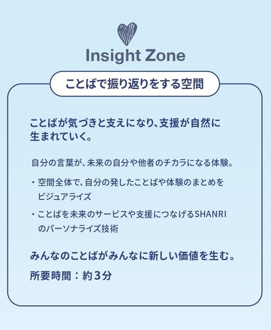 SHANRIが提供する「ことば」起点のソリューションは、単なる情報処理を超え、“支援になる言葉”へと変換する対話体験を重視しています。今回の取り組みでは、オーバーキャストが強みを持つ情報設計・動線設計のデザインを通じて、利用者の行動と認知に寄り添った展示空間の企画を行いました。
