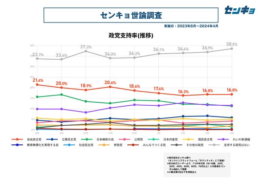 株式会社センキョ(所在地:東京都港区、代表取締役:堀 浩之)は、2023年8月より毎月、自社で運営する全国386万人余りの市民が参加するプラットフォーム「タウンマッチ」において、内閣の支持率や政党の支持率などを調査する「世論調査」を実施しています。政治に関する新たな調査データとして、政治関係者や有識者だけではなく、幅広く多くの方にご活用いただけますと幸いです。