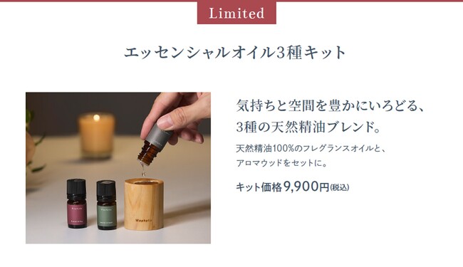 初のホリデー限定アイテムとして登場するのは、天然精油100%のアロマフレグランス。洗練されたこだわりの調香で、シーンや気分に合わせて選べる香り豊かな3種のブレンドエッセンシャルオイルと、一瞬でみずみずしい香りに包まれるルーム&ファブリックミストをご用意しました。オリジナルのウッドディフューザーには、東三河のヒノキの端材をアップサイクルして活用。火や電気を使わず、お好きな空間に持ち運んで香りをお楽しみいただけます。
