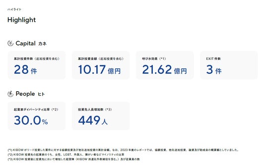 *2 KIBOW がリード投資した案件に対する協調投資及び他社追加投資の累計金額。なお、2023 年度のレポートでは、協調投資、他社追加投資、融資及び助成金の概算額としていました。