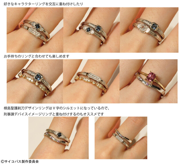 公安局刑事課が作中で使用しているデバイスを、リングのデザインとして細部まで丁寧に再現しました。監視官デザインリング2モデル、執行官デザインリング4モデルの計6モデルを用意。それぞれキャラクターの誕生石が埋め込まれています。宝石は全て、宝石専門店であるカラッツが海外で厳選して買い付けたものを使用しています。