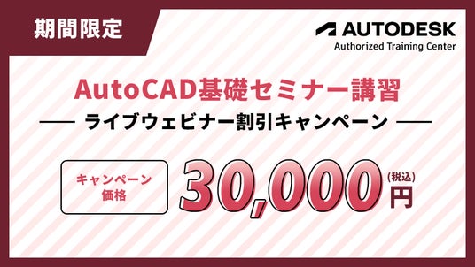 AutoCAD基礎セミナー講習は、ライブウェビナーを通常価格38,500円(税込)のところ、30,000円(税込)でご受講いただける割引キャンペーンを2025年4月30日(水)まで行います。
