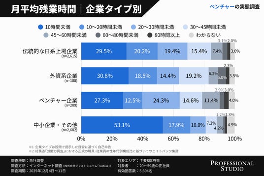 そこで、ベンチャー・中小企業向けのHR総合支援サービスを行うProfessional Studio株式会社( https://professional-studio.co.jp/ )(本社:東京都中央区、代表:市川龍太郎)は、ベンチャー企業の仕事環境と社員の意識を明らかにするため、主要都府県に在住する20歳~59歳の正社員5,694名を対象に、企業タイプごとの比較調査を行いました。