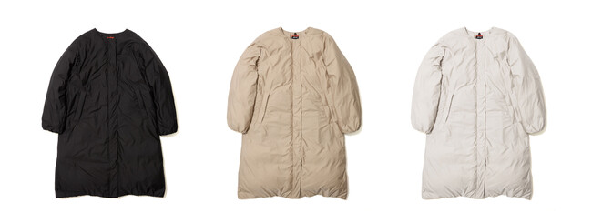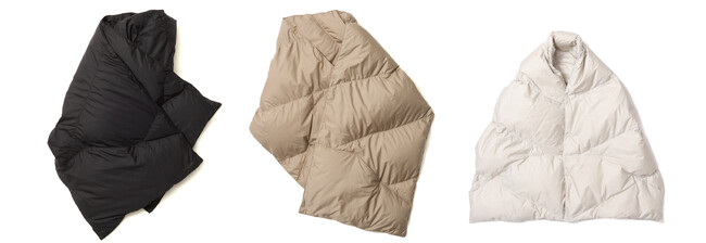11月10日にリリースされる「NO COLLAR DOWN COAT」「DOWN PONCHO MUFFLER」は同素材のナイロン生地を使用しており、セットで着用することで多彩なスタイリングが楽しめます。