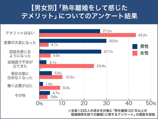男性は1位が「家事が大変になった」、2位に「孤独を感じるようになった」が入り、「デメリットはない」が3位です。