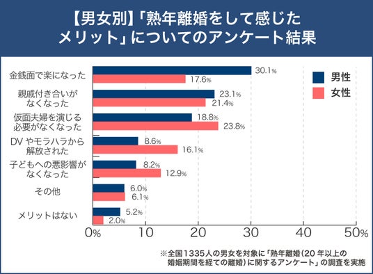 メリットでは、男性のランキングは1位が「金銭面で楽になった」、2位は「親戚付き合いがなくなった」、3位は「仮面夫婦を演じる必要がなくなった」と全体と変わらないものの、女性では1位が「仮面夫婦を演じる必要がなくなった」、2位は「親戚付き合いがなくなった」、3位は「金銭面で楽になった」となりました。