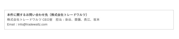 (注1)「TradeWaltz」は日本国内における株式会社トレードワルツの登録商標です。その他の商品名、会社名、団体名は、各社の商標または登録商標です。