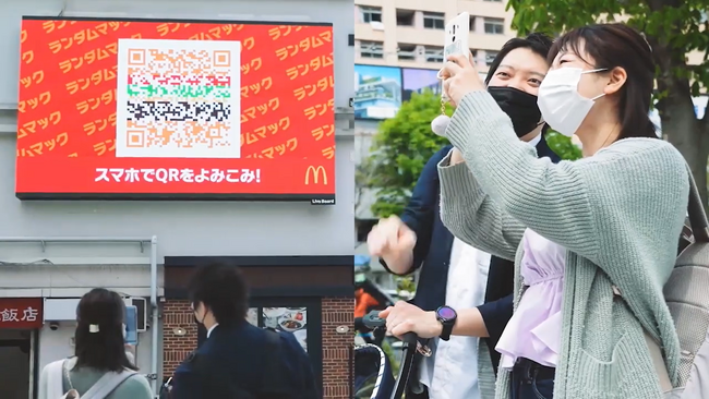 コロナ禍で人とモノの出会う機会が減り、日常はルーティン化。食事を選ぶ際も、いつもの見慣れた安心感を求めて、つい同じものを頼んでしまう「メニューの固定化」心理が加速していた。そんな若者たちの不満や疲れの声がマクドナルド公式Twitterにも届くなど、楽しいはずのランチタイムにも閉塞感が漂っていた。そこでマクドナルドは、人々の冒険心に火をつけるため、メニューが予想できない偶然の出会いを作り、メニューに紐づいた複数のQRコードを重ねて「動き続けるQRコード」を開発。それを気候や時間などリアルタイムで変化する環境に合わせて、日本全国のデジタルOOHで放映した。スマホで動くQRコードを読み込むと、ランダムにメニューがおすすめされ、モバイルオーダーでそのまま直接注文できる仕組み。「メニューの固定化」に変化を与え、ルーティン化され閉塞感のあるランチタイムに予想できないワクワクする体験を提供した施策。