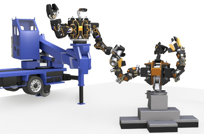 本 PoC 試作機の運用例の一つとして、デッキリフトや高所作業車などのデッキ上での運用が想定されています。接触を伴わない大まかな位置決めはデッキリフト等で行ない、微細な調整と力制御が必要となる、接触を伴う位置決めを本 PoC 試作機で行なうことで、これまで人力に依存していた設置作業を機械化し、作業効率を向上させることができます。主にクレーン設備がないまたはクレーン車の吊上高に制限がある環境下(橋梁下等)での活用を想定しています。