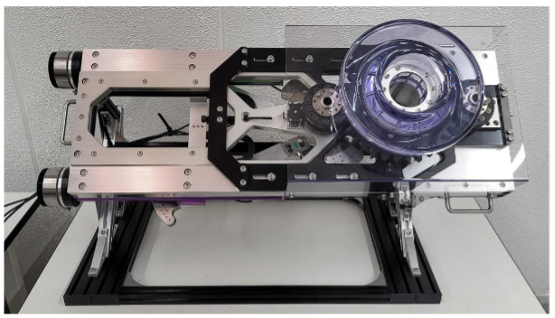 人機 EPD ver.1.2 は、無段変速機構を有する電動アクチュエータユニットの社会実装を目的として人機一体が独自開発した原理試作としての PoC 試作機です。2 台の直動アクチュエータが受動回転関節を介して二つの駆動リンクに接続されており、各リンクは片持軸で支持された多段構成となっています。リンク同士が動作範囲内で干渉を回避できる機構とすることで、出力軸は無限回転が可能となり、滑らかな可変減速比を実現しています。本アクチュエータユニットの搭載により、高出力を求められる重作業と素早さを求められる繊細な作業を両立することのできる剛柔自在な次世代型電動重機の社会実装を目指しています。現在は、制御システムの改良実装に向けて九州大学ヒューマンセンタードロボティクス研究室(田原健二教授)と共同研究開発が進んでおり、本展示は田原健二教授グループと共同で運営されます。