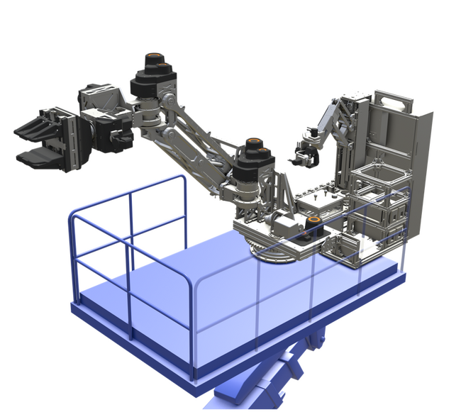 本 PoC 試作機は、高所作業車などのデッキ上に設置した状態で運用することが想定されており、本体に搭載されたウインチにて地上から部材を引き上げ、高所作業車のデッキ上もしくは空中で直接部材を把持できます。操作系統は、本体後方に搭載されている操縦席での近接操作と、本体の先端部分についた操作グリップでの直接操作の二つあり、現場の状況に応じた柔軟な協調作業が可能となります。