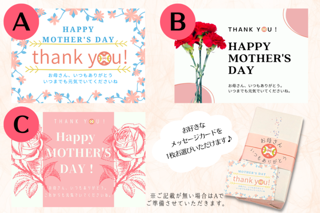 オシャレでポップな色合いの母の日限定ギフトカードを3枚ご準備させていただきました。お好きな1枚をお選びいただけます。直接言うとなると照れてしまう「ありがとう」の言葉も、可愛らしいギフトカードに思いを込めれば日頃の感謝をお伝えすることができます。※文面の変更は出来かねますので予めご了承ください。