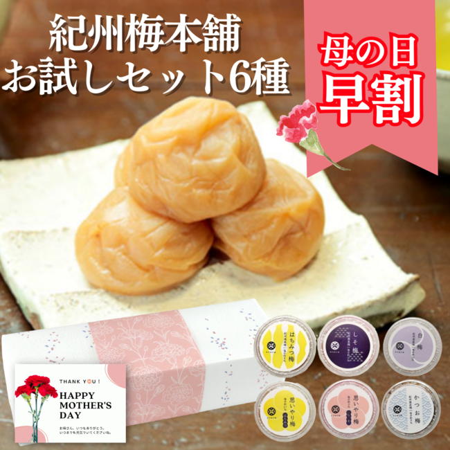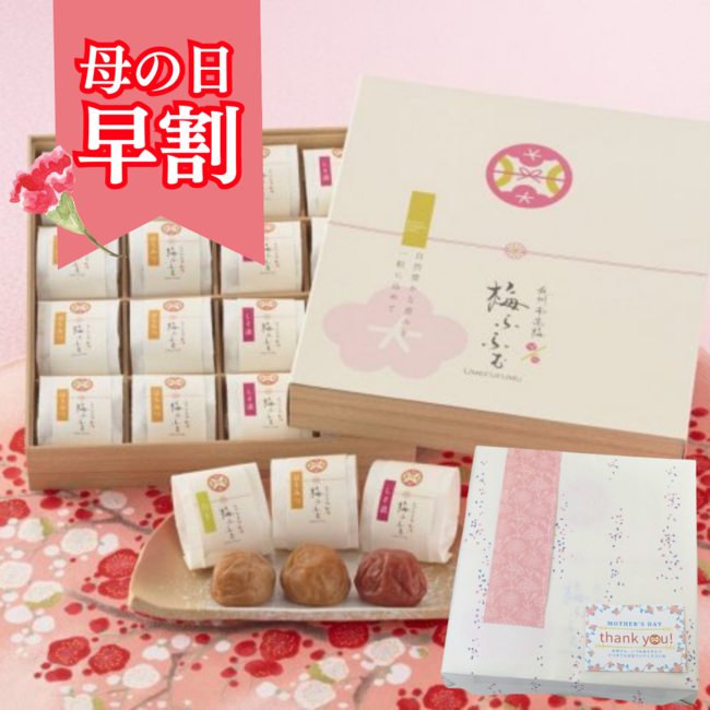 和歌山県で梅干し屋を営む紀州梅本舗(和歌山県西牟婁郡白浜町、代表取締役:大岩崇)は自社HP・楽天市場にて2023年5月14日(日)母の日に向けて、人気商品「紀州うめノほし」(https://www.ume-honpo.co.jp/?pid=174157345)「梅ふふむ」(https://www.ume-honpo.co.jp/?pid=174152559)「お試しセット」(https://www.ume-honpo.co.jp/?pid=174157632)「UME NO TERRINE CHOCOLAT」(https://umenoterrinechocolat.stores.jp/items/6424f629248f8c002d99ead3)を母の日特別包装&3種類から選べるメッセージカード付でご準備させていただきました。(販売期間:4月14日(金)~5月10日(水))