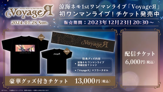 本ライブはSPWNにて配信され、チケットサイトでは「涼海ネモ ワンマンライブ開催記念Tシャツ」や「VoyageЯマフラータオル」が手に入る、豪華特典付きチケットなどが販売中です。