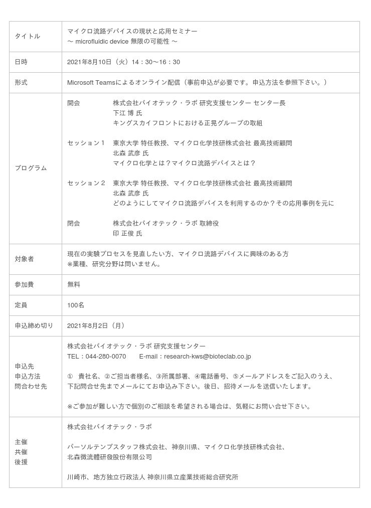 総合人材サービスのパーソルグループで人材派遣・アウトソーシング事業を手掛けるパーソルテンプスタッフ株式会社(本社: 東京都渋谷区、代表取締役社長: 木村 和成、以下パーソルテンプスタッフ)は、株式会社バイオテック・ラボの「マイクロ流路デバイスの現状と応用セミナー」を神奈川県、マイクロ化学技研株式会社、北森微流體研發股份有限公司と共に、8月10日開催いたします。