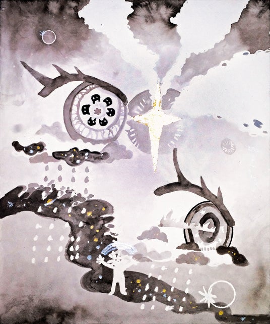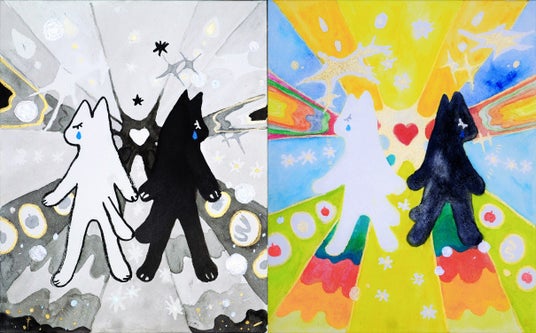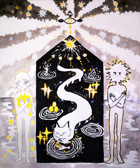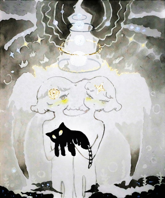 ふとした瞬間に、宇宙は光と影の2つの要素から構成されているのではないかと感じます。観察者の「レンズ=眼」が異なれば、光の関係も変化します。私は、重力など常識の法則がない新しい世界を再構築するために、創作を行っています。心と眼は自己を開くための通路であり、世界とのコミュニケーション手段です。心で暗闇を感じ取り、眼で光を記録するのです。有機物でも無機物でも、日常の全ての存在は私の世界にとって親密な一部になります。そして、心で感じる見えないものと目が感じる見えるものの相互作用が神話や冒険のような画像を形成します。墨や手元にあるすべての素材を使って、1つの画像を「心」と「眼」という2つの異なる感覚で表現します。東アジアの文脈において、精神世界と「眼」を通して見た世界は異なります。同一画面に2種類の表現方法が混在する理由は、同じ情報を受信した時でも「心」と「眼」がそれぞれ異なる受像器官として、異なる世界を描き出すからです。同時に、「心眼」は中国語で「思考や魂の真実の描写」という意味があります。私の絵画作品、立体作品、共同作品、そして15日の音楽パフォーマンスとトークによって、異なる視点から私の光と影を提示したいと思います。