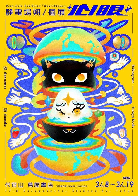 研美株式会社(本社:東京都渋谷区 代表取締役:厳研)が運営するクリエイターズユニット「SOMSOC GALLERY(ソムソクギャラリー)」は、SOMSOCの世界観を体現するアーティスト・静電場朔(せいでんばさく、英語表記:Dian)の個展「心眼」を代官山 蔦屋書店で2024年3月8日(金) から3月19日(火)まで開催します。本展では静電場朔の最新作品のほかに、限定のコラボ商品の展示や販売が行われます。また、3月15日(金)には静電場朔が登壇する音楽&トークライブの開催が決定しています。