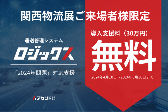 物流DXを推進するアセンド株式会社(本社:東京都新宿区、代表取締役:日下瑞貴、以下「当社」)は、提供するトラック運送事業者向け運送管理システム「ロジックス」において、関西物流展のご来場者様限定で、導入支援料(30万円)の無料キャンペーン(以下、「当キャンペーン」)を実施することをお知らせいたします。これにより「物流の2024年問題」に突入した運送事業者様のDX・経営強化支援を加速してまいります。