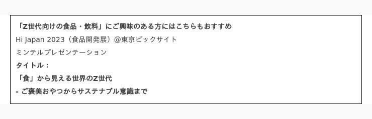 例:楽しさ、懐かしさを覚える味の提案、Z世代向けの夜の間食