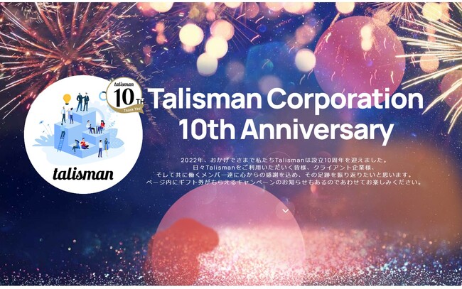 2022年、専門職特化型人材紹介・RPO・派遣などの総合人材サービスを展開する、タリスマン株式会社が設立10周年を迎えました。これを記念して、タリスマンの10年の歩みを振り返りながら各種キャンペーンを告知するスペシャルサイトが、8月31日よりオープンいたしました。