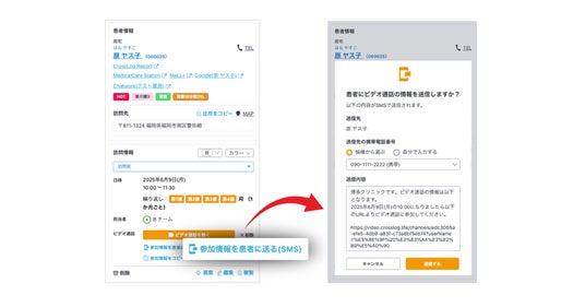 クロスログに登録されている連絡先に参加情報をSMS(ショートメッセージ)で通知できます。手間なくスムーズにビデオ通話を始めることができます。