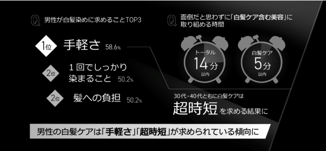 男性が白髪染めに求めるのは「手軽さ」「1回でしっかり染まること」「髪への負担」また、面倒だと思わずに、30・40代男性が白髪ケアに取り組める時間は「5分以内」と“超時短”を求める結果に。