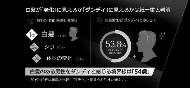 グレイヘア俳優などの影響を受け、白髪男性を「ダンディ」と感じる人は53.8%。 一方、相手の老化を感じる部分トップも「白髪(72.8%)」という結果に。白髪が「老化」に見えるか「ダンディ」に見えるかは紙一重であると判明。
