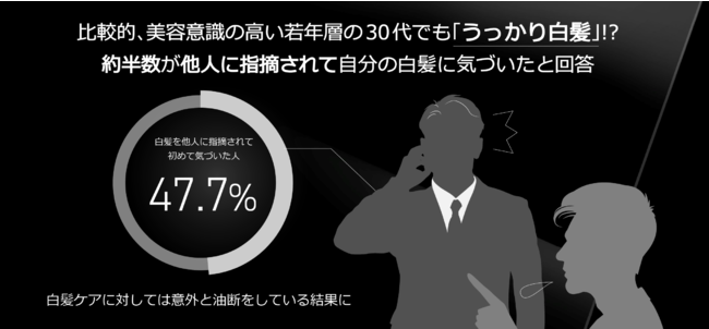 「人から指摘されて初めて白髪に気づいた経験があるか」と質問したところ、30代男性の約半数である47.7%が「うっかり白髪」の経験があると回答しました。年代別でみると20代では33.3%、40代では24.1%、50代では20.3%と、年代が低いほど白髪に対して油断をしている人が多い傾向に。30代女性の「うっかり白髪」率は12.8%と少なく、男性は同年代女性と比べて、白髪に対しての意識やケアが不足していることがわかりました。