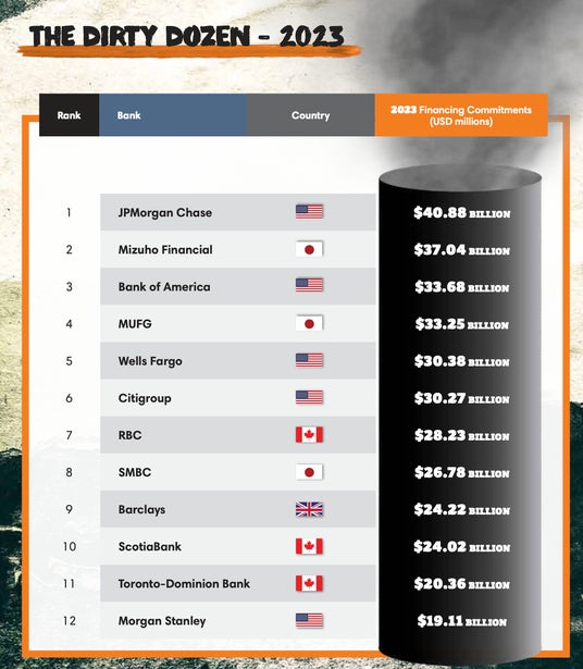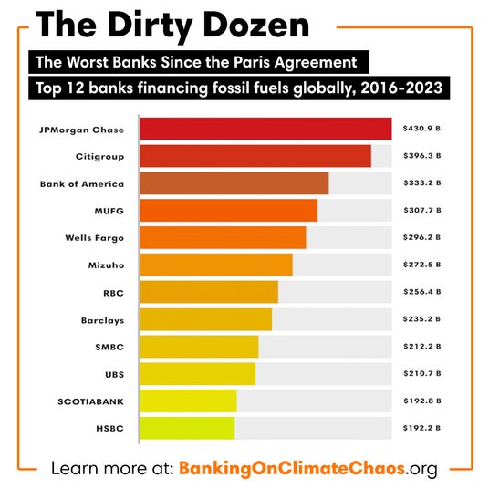 - 「化石燃料全部門」ではJPモルガン・チェースが1位で、化石燃料企業に約408億ドルの資金提供を行った。「化石燃料拡大企業」への資金提供でも1位だった。