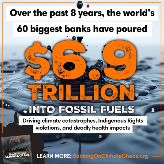 本報告書は、世界の主要民間銀行60行による4,200社以上の化石燃料産業への融資・引受をまとめた包括的な調査報告です。分析の結果、パリ協定採択後の2016年から2023年の8年間に銀行から化石燃料産業に約6.9兆米ドルが提供され、約半分の約3.3兆ドルが化石燃料拡大のために投入されたことが明らかになりました。また、昨年の提供額は約7,050億ドルで、化石燃料拡大企業への提供額は約3,470億ドルでした。今回は新たな方法論を採用し、主幹事銀行の取引信用額だけでなく、取引に参加した各行の資金支援も明らかにしました。執筆に携わったNGOは、本報告書は気候危機の資金源を調査した最も正確かつ包括的な分析で、銀行のグリーンウォッシュ(見せかけの環境対応)を白日の下にさらしていると指摘しました。