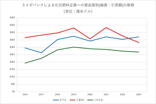 - 「化石燃料全部門」の2位はみずほで、資金提供額は約370億ドルだった。「化石燃料拡大企業」への資金提供でも2位(約188億ドル)で、両部門での増加が目立った。