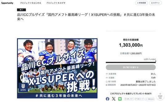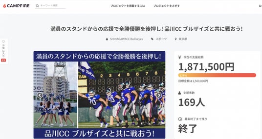 日本社会人アメリカンフットボール協会 Xリーグ X1Area 所属の 品川CC ブルザイズは、年間数千万円のチーム運営費を獲得する手段のひとつとして、クラウドファンディングを複数年数実施し、自ら掲げた100万円以上の目標を、連続して達成しています。