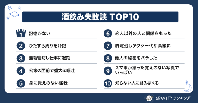 ~1位「記憶がない」、2位「ひたすら周りを介抱」、3位「翌朝寝坊し仕事に遅刻」。“お酒は飲んでも飲まれるな”という言葉が身に染みる結果に!?~