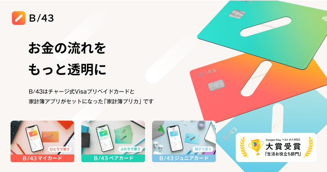 「B/43」とは、プリペイドカードと家計簿アプリがセットになった新しい支出管理サービスです。毎月の予算をプリペイドカードにチャージして支払いを行うだけで、アプリに支出の明細がリアルタイムで反映されるため、簡単に支出管理が可能です。夫婦や同棲カップルで使える「B/43ペアカード」では、一つの口座で二つのカードが作れて面倒な割り勘や現金のやり取りが不要になり、ふたりで一緒に支出を確認できます。また、親子向けの「B/43ジュニアカード」ではキャッシュレスでお小遣いを渡し、親子で一緒にお金の管理ができます。