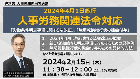 企業法務分野に精通した弁護士法人京都総合法律事務所(所在地:京都府中京区)は、2024年4月に施行される「労働条件明示事項の改正」を題材にしたオンラインセミナーを、企業経営者、人事労務担当者さまを対象に2024年2月15日(木)に開催いたします。