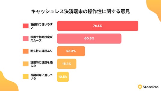 キャッシュレス決済端末の情報メディア「StorePro」 は、店舗経営者を対象に、キャッシュレス決済端末の操作性や使いやすさに関する調査を実施しました。本調査では、端末の直感性や設置の容易さ、耐久性、管理機能についてのユーザーの声を分析しました。その結果、操作性に関して76%がポジティブな評価をしている一方で、設置や耐久性に課題を感じる声も一定数見受けられました。