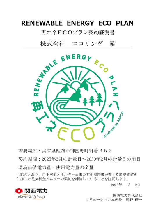 また新本社屋における購入電力の100%は、関西電力株式会社が提供する「再エネECOプラン」を活用し、実質再生可能エネルギー由来のCO2フリーの電気を使用しております。