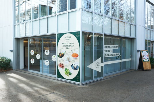 「Beyond The Taste」のキービジュアルをガラス面に大きく配しました。6自治体のふるさと納税返礼品のシズル感ある試食品写真がアイキャッチとなっています。