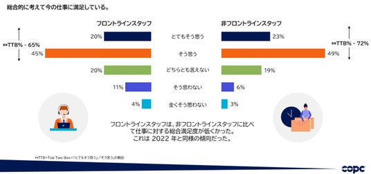 ・総合満足度はフロントラインスタッフで65%、非フロントラインスタッフで72%であり、非フロントラインスタッフのほうが高いことがわかりました。
