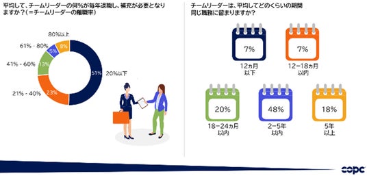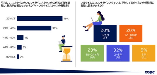 フロントラインスタッフもリーダーも離職率が20%以上と回答したのは半分でした。リーダーにおいては「平均して18ヵ月以内職務に留まる」と回答したのはわずか14%のみであるのに対して、オペレーターにおいては40%と、オペレーターの方が同じ職務に留まりにくいことがわかりました。