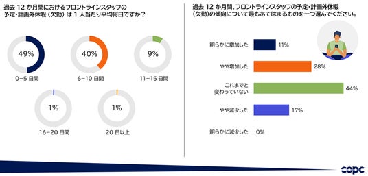 フロントラインスタッフ(顧客対応を行うオペレーターなど)の予定外欠勤は1人あたり0-5日が最も多く、予定外欠勤については約40%がやや増加していると回答していました。