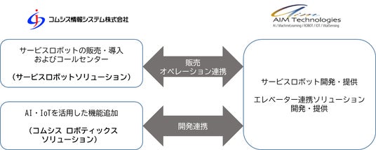 コムシス情報システムの「サービスロボットソリューション※1」(サービスロボットの販売・導入・運用支援および全国一元窓口のコールセンターサービス)と、「コムシス ロボティクスソリューション※2」(AI・IoTを活用したサービスロボットの機能追加やカスタマイズ)、具体的には、コムシス情報システムが全国規模のインフラを活用してロボットの販売、設置、コールセンターなどの運用支援および、お客様対応を一貫して担うとともに、エイム・テクノロジーズが高度なロボット開発やエレベーター連携技術を提供し、顧客の多様なニーズに応じたソリューションを実現します。これにより、両社は人手不足や業務効率化といった社会課題の解決に向けた取り組みを加速させ、ロボティクス市場のさらなる拡大を目指します。