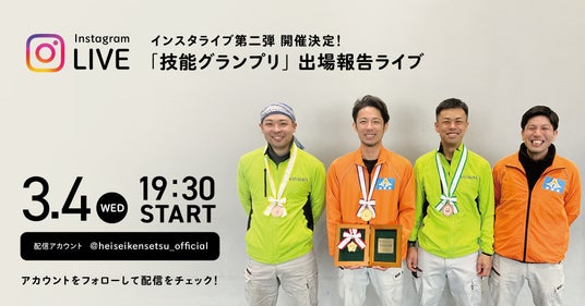 この度の快挙を記念して、平成建設公式Instagramにてライブ配信を実施いたします! 見事日本一に輝いた大工の喜びの声はもちろん、共に激戦を戦い抜いたメンバーによる、大会の裏側やライブ配信でしか聞けないエピソードをたっぷりとお届けします。