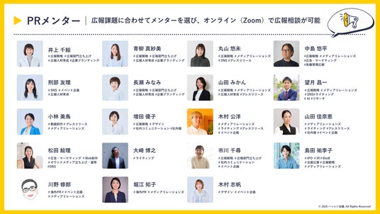当社が主宰するPRコミュニティでは【学び・相談・交流の場】をワンストップで提供しています。現在19名在籍するPRメンターに対し、広報戦略やプレスリリースの作成、SNS運用はもちろん、AI活用、海外PR、動画制作、ライティングなどの幅広い悩みを相談することが可能です。