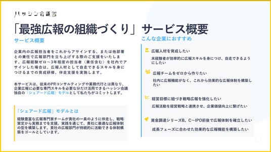 ハッシン会議は企業価値向上に貢献する広報組織・広報人材育成のエキスパートです。持続的な発信活動を行う自走型組織の立ち上げ・定着に強みを持ち、各領域のプロフェッショナルが組織づくりをチームで伴走支援。クライアント企業内に人材やリソース、知見を蓄積していくことをゴールとしており、独自の人材育成プログラムとeラーニング「Learney」、広報担当者のコミュニティ「ハッシン会議」が組織の成長を促進します。