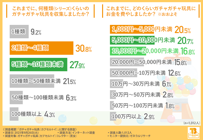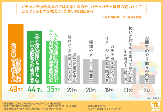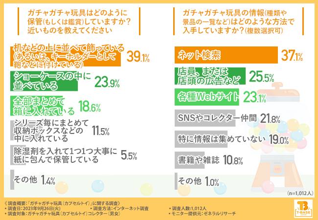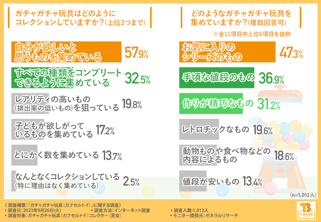 『T-BASE JAPAN』を運営するトイズキング(本社所在地:名古屋市中村区、代表者:山本 祐介)は、ガチャガチャ玩具コレクターを対象に、「ガチャガチャ玩具の魅力」に関する調査を実施しました。