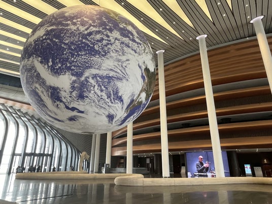 Luke Jarram 《Gaia》 2018とXu Zhen 《HELLO》2024のあるセンター会場