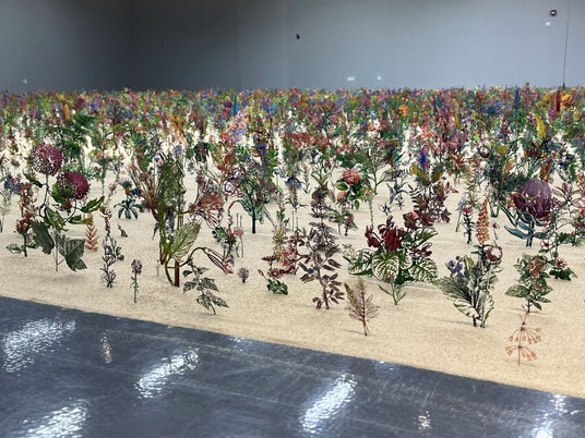 第3章では社会問題と密接に関わり合う現代アートが持つひとつのあり方を、バイオやロボットなどの技術に注目しつつ、環境問題と人類の持続可能性をテーマとした作品を展示しています。ザドク・ベン=ダヴィド(イスラエル)が創る黒い葉脈の草花の草原は、見る者の身体の移動により、カラフルな風景へと一転します。生と死の鮮やかな変転は、環境へのまなざしとともに、小さな行動の可能性の気づきと勇気をくれます。一方、劉建華(中国)は、床や壁を這う黒いブロンズで、未知なる生命体の不気味な “蔓延”を感じさせ、現代が持つ病巣と未来への不安を想起させます。