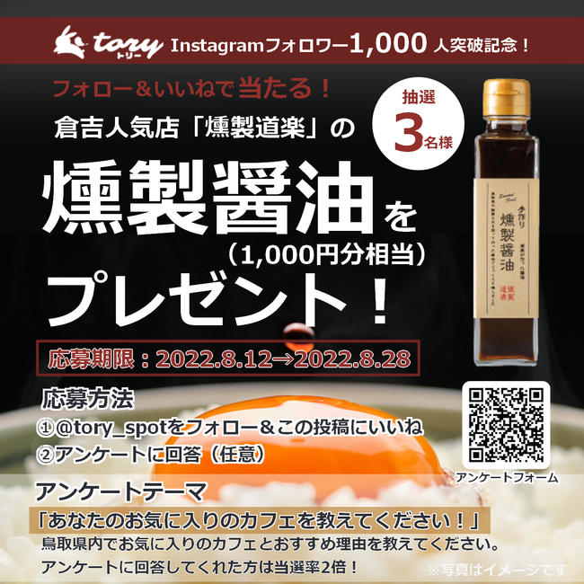 鳥取の女性向けにグルメ・イベント情報を発信するメディア「tory」(本社:鳥取県鳥取市、代表:大森誠)の、公式Instagramが8月6日に1000フォロワーを突破したことを記念してプレゼントキャンペーンを開始しました。