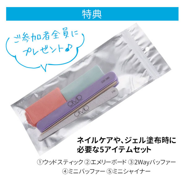 参加者全員にネイルケア、ジェル塗布時に必要なバッファーやシャイナーなど、5アイテムをセットにした「〈OMD〉ネイルケアセット」をプレゼント。